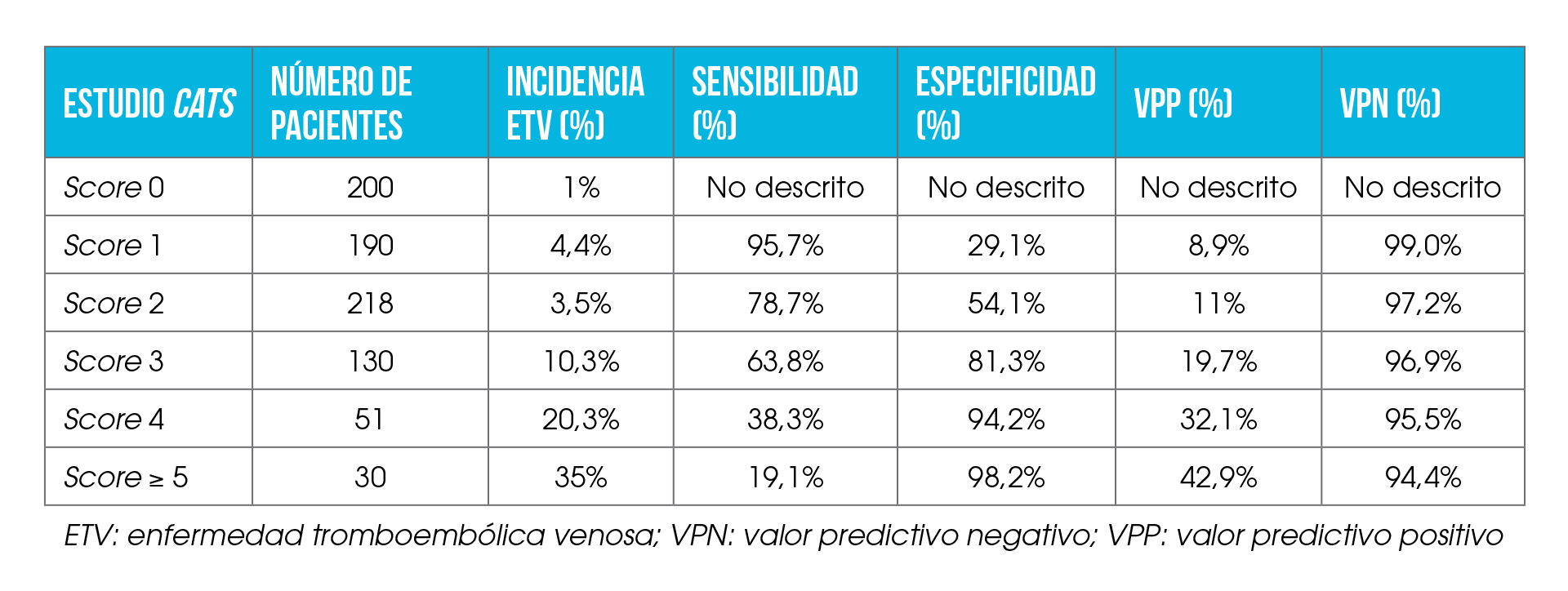 En la cohorte del estudio CATS de Viena, el score de Khorana fue ampliado incluyendo 2 nuevas variables: D-dímero y P-selectina. P-selectina es una molécula de adhesión celular y marcador de activación plaquetaria que está implicada directamente en la formación del trombo. P-selectina se ha asociado con ETV en pacientes sin cáncer y con la aparición de recurrencia. Junto con D-dímero, se ha asociado con un incremento de ETV 2,6 veces en pacientes con cáncer en un trabajo realizado por el mismo grupo austríaco. En este modelo de Viena se asigna 1 punto por cada una de las variables si se encuentran elevadas (D-dímero ≥ 1.440 ng/mL y P-selectina ≥ 53,1 mg/mL) y se añade a la puntuación obtenida en el score de Khorana [4]. Con la inclusión de estos 2 biomarcadores y la extensión del periodo de seguimiento (mediana de seguimiento: 21,4 meses) se incrementó de forma notable la capacidad de predicción del score original (Tabla 4). La probabilidad de desarrollar un evento tromboembólico fue 26 veces mayor en la categoría de mayor riesgo en comparación con la de menor riesgo. Sin embargo, los pacientes incluidos en las categorías ≥ 5 puntos tan solo fueron 30 pacientes, una minoría de los pacientes incluidos en el análisis. Se observó una mayor incidencia de ETV en los pacientes con un score de 1 punto que en los pacientes con 2 puntos. Una de las críticas de este modelo es que se incluyeron pacientes muy heterogéneos: pacientes tratados con quimioterapia, radioterapia, operados o incluso sin tratamiento. Este modelo no ha sido validado por el momento ni interna ni externamente.