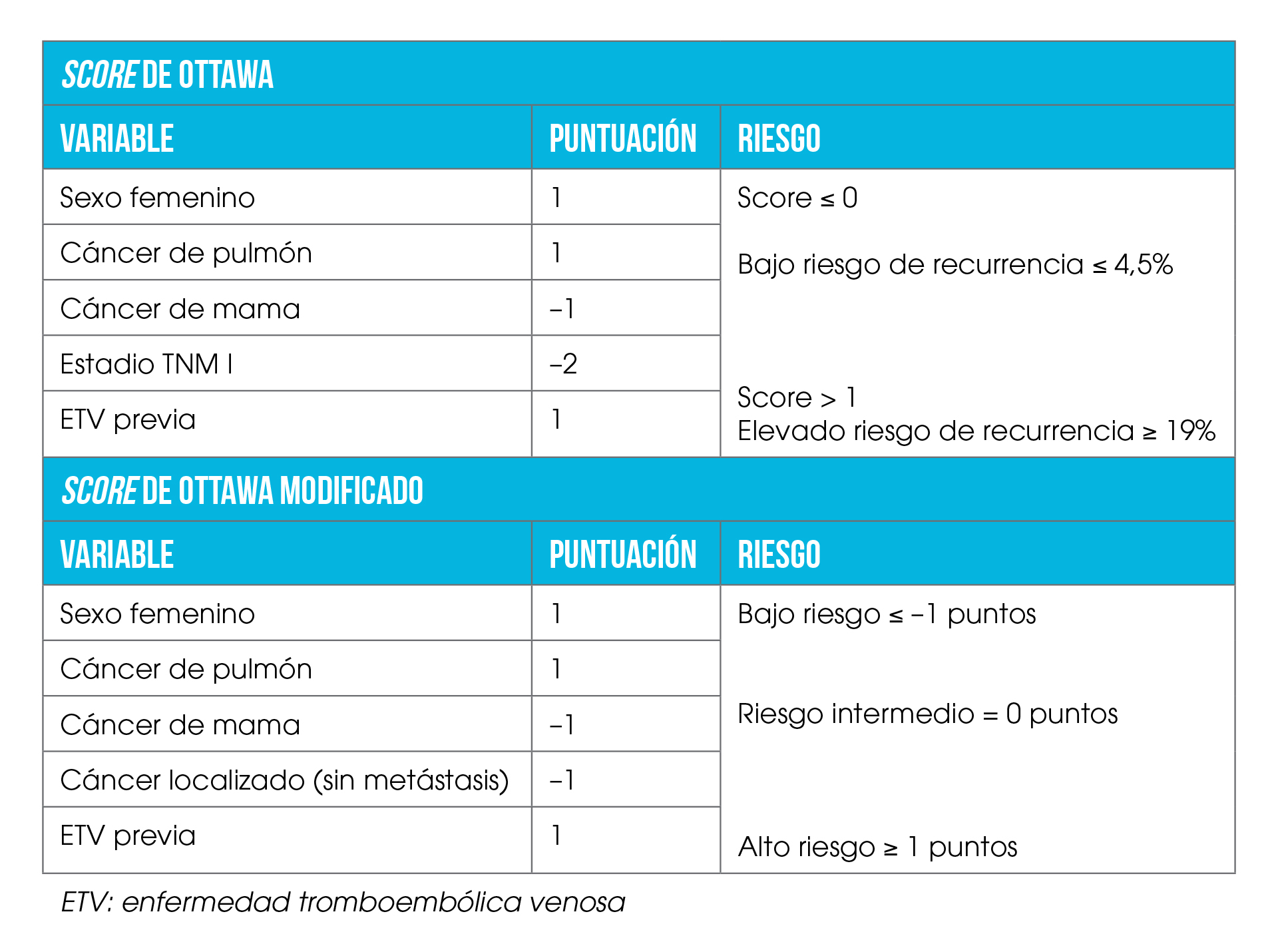El grupo holandés validó externamente el score de Ottawa en una cohorte de 419 pacientes. Se consiguió reproducir los datos estableciendo 3 grupos de riesgo: bajo riesgo de recurrencia de ETV (2,4%), riesgo intermedio (8,8%) y alto riesgo (15,9%) [49]. Por el contrario, se intentó sin éxito una segunda validación en una cohorte de pacientes procedentes de Corea [50]. En la categoría de bajo riesgo se observó una incidencia de ETV de 13,2%, claramente elevada, no validando lo previamente descrito en el score inicial. Por último, en un análisis post hoc del estudio CATCH tampoco se validaron los resultados del score de Ottawa [51]. La distribución de recurrencia en las 3 categorías de riesgo fue: bajo riesgo 3,4%, riesgo intermedio 9,7% y alto riesgo 8,2%. Actualmente, el empleo de este score en la práctica clínica habitual es muy limitado y no recomendado por las principales guías clínicas nacionales e internacionales.
