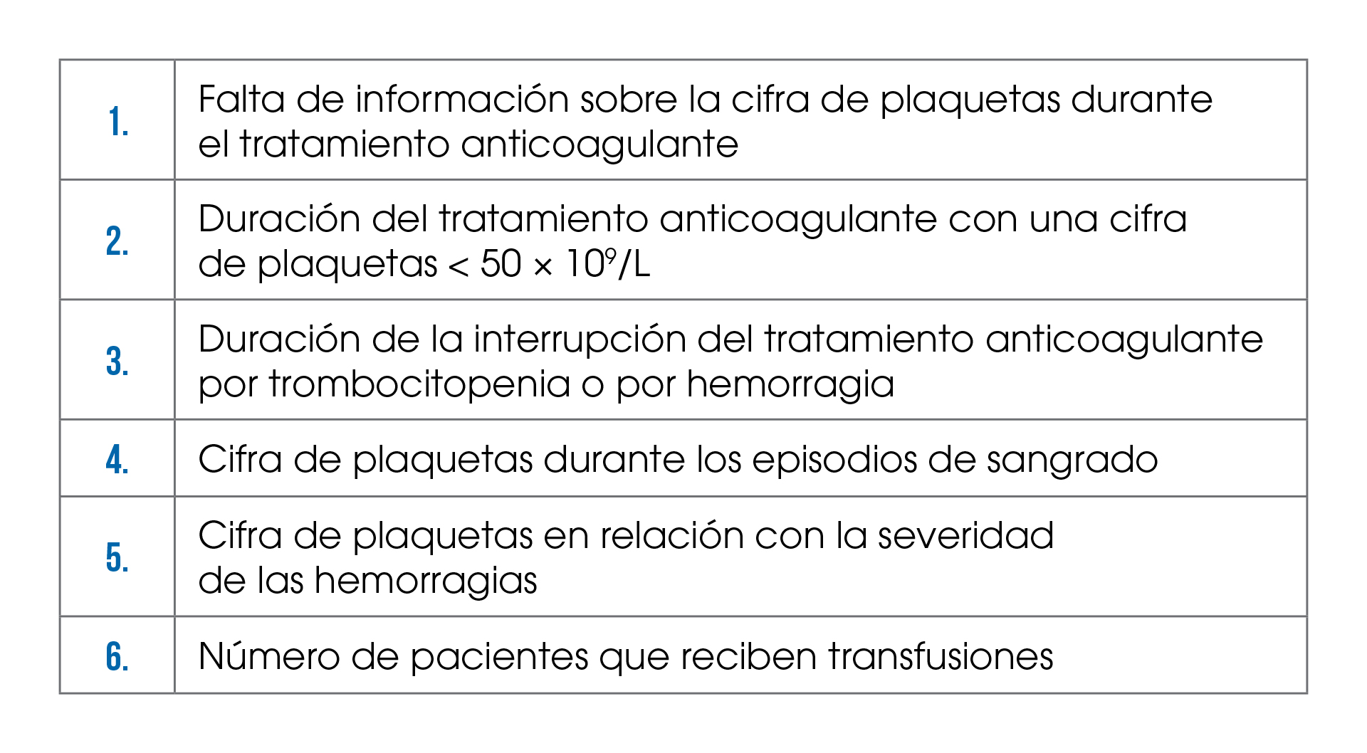 En los 3 ensayos clínicos que comparan HBPM frente a ACOD, la cifra de plaquetas límite por debajo de la cual se suspendía el tratamiento anticoagulante fue de 50 × 109/L. Sin embargo, en cada uno de los 3 estudios la cifra de plaquetas que se consideró como criterio de exclusión de pacientes fue diferente, 50 × 109/L en el Hokusai VTE Cancer (edoxabán vs. dalteparina), 75 × 109/L en el Caravaggio (apixabán vs. dalteparina) y 100 × 109/L en el SELECT-D (rivaroxabán vs. dalteparina).