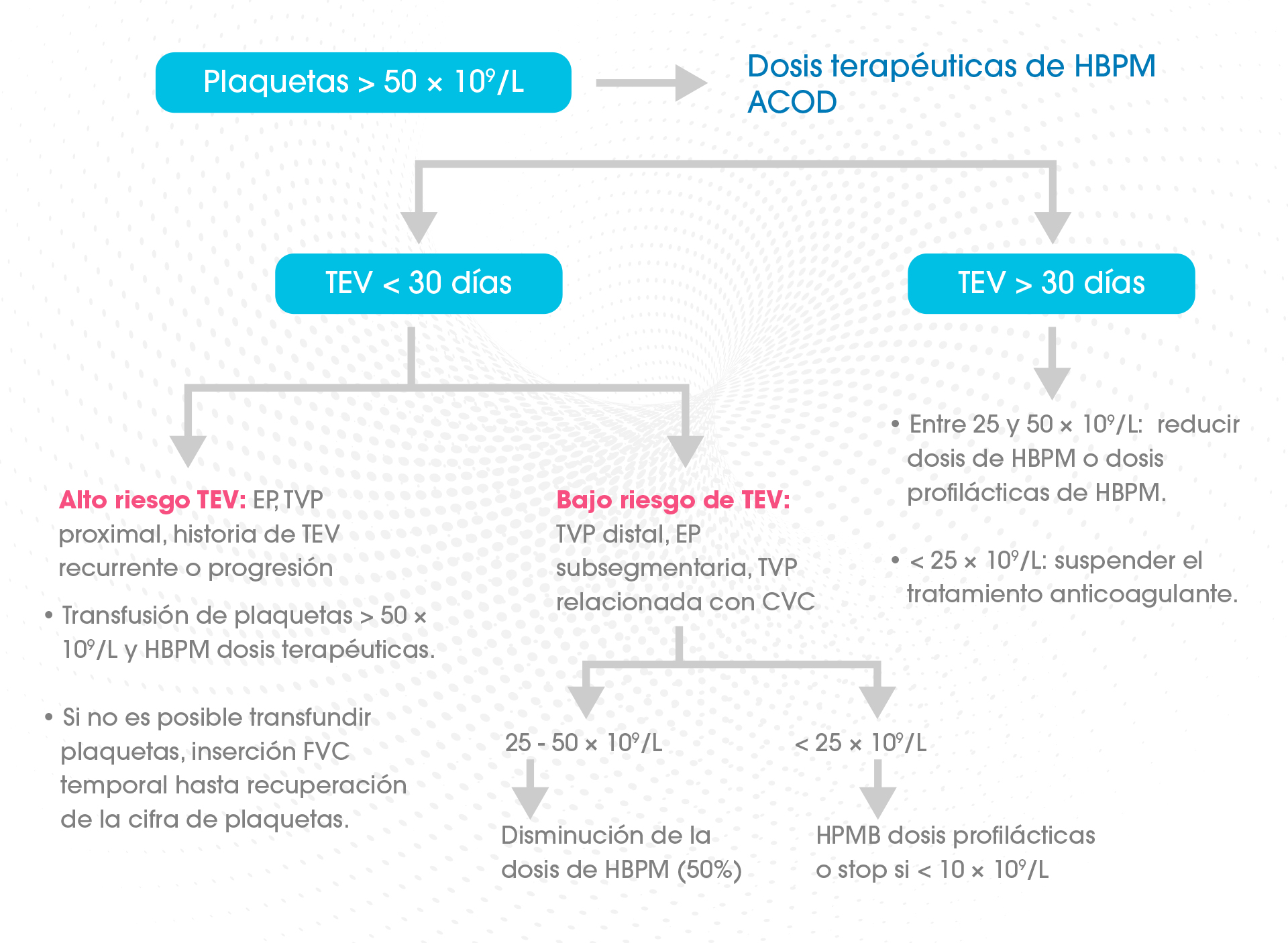 Si a pesar de que el paciente está estable, el TEV es muy grave, recurrente o progresa en contexto de dosis de HBPM reducidas, se debe considerar la transfusión de plaquetas por encima de 50 × 109/L con el objetivo de poder anticoagular a dosis plenas.