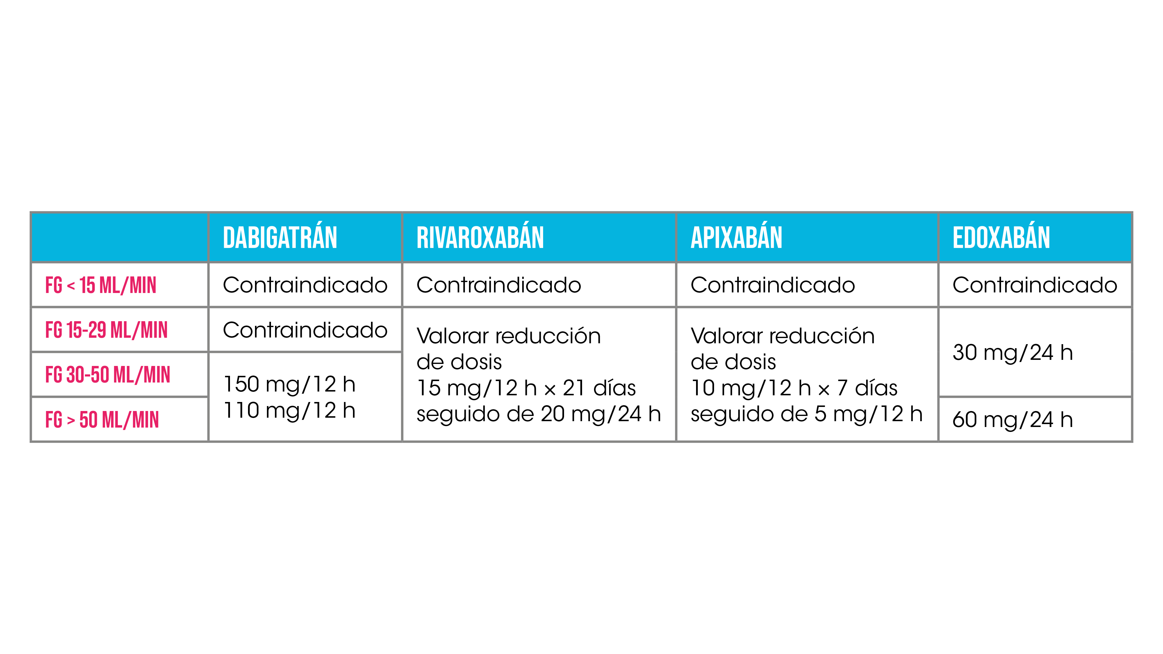 - Revisamos el tratamiento anticoagulante según su peso (86 kg) y FG (29,36 mL/min) y observamos que no se ha realizado el ajuste de dosis por FG, según las recomendaciones de la ficha técnica (Tabla 1).