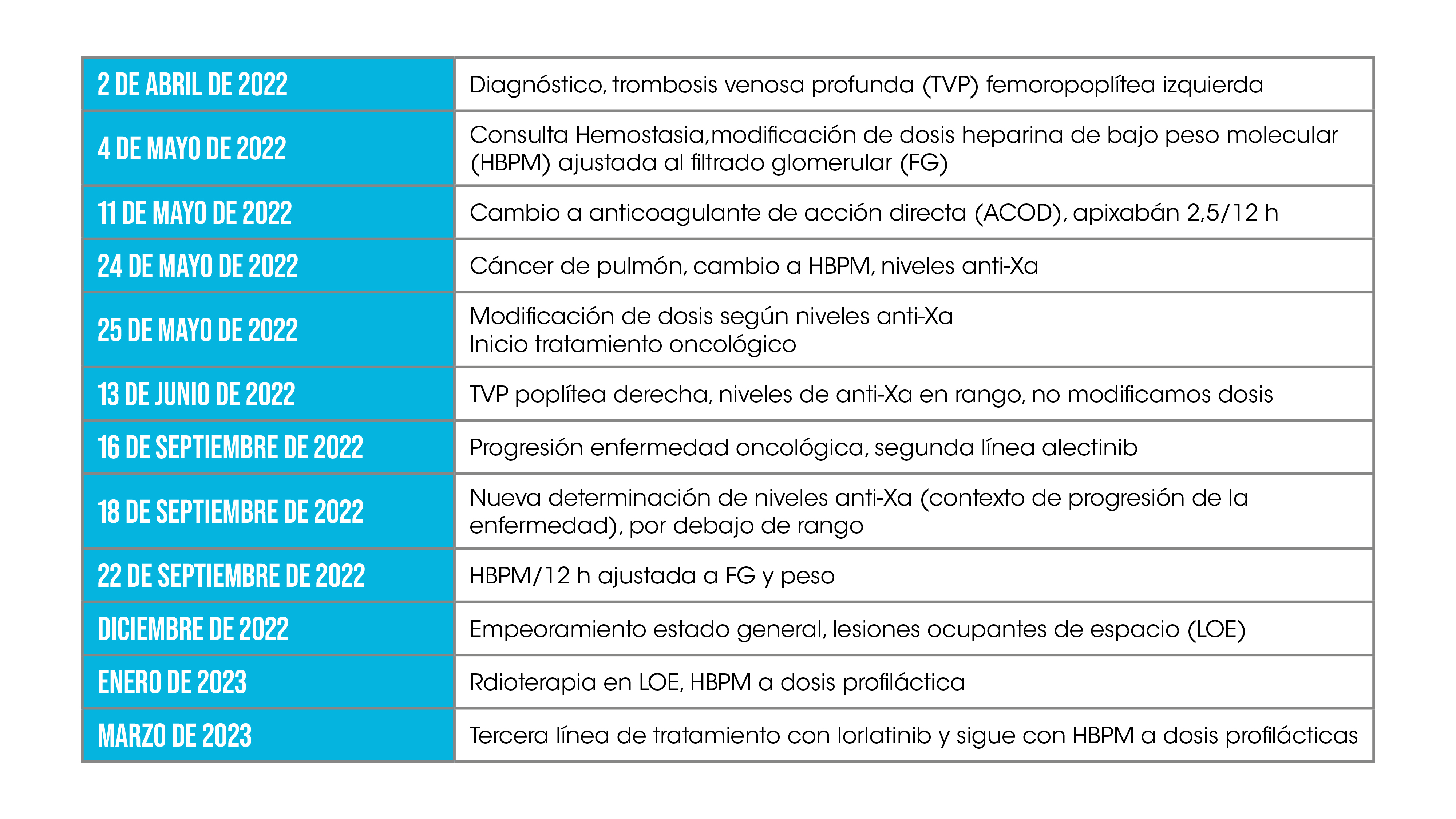 Tras el diagnóstico de cáncer de pulmón, decidimos el paso a HBPM ajustada a los datos de función renal sin determinación inicial de los niveles de anti-Xa, pero a las pocas semanas, dada la aparición de un nuevo evento trombótico, sí que había indicación de realizar dichos niveles una vez que aseguramos la adherencia terapéutica de la paciente. En este caso, aumentamos la dosis, ya que los niveles fueron muy por debajo de los recomendados y la paciente estaba con un estado protrombótico. La evolución de la paciente en cuanto al evento trombótico fue favorable, sin episodios de retrombosis ni eventos hemorrágicos, manteniendo los niveles de FG en torno a 30 mL/min, pero la evolución de la enfermedad oncológica fue desfavorable, con progresión de la enfermedad a nivel local y cerebral, con la aparición de metástasis cerebrales que requirieron radioterapia local y cambio a una tercera línea de tratamiento.
