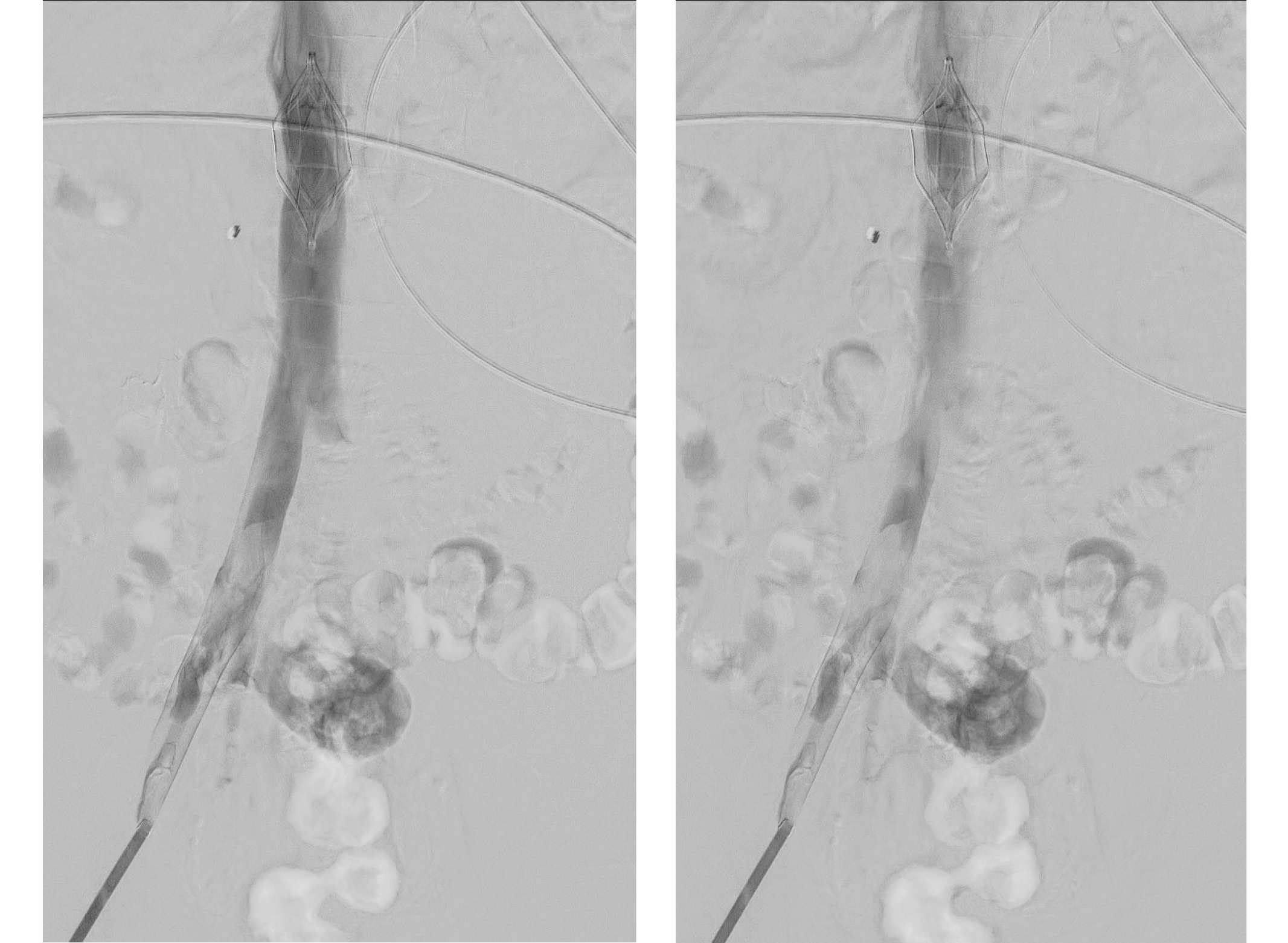 Un día más tarde, el paciente presentó una inestabilidad hemodinámica, descenso de hemoglobina de 30 g/L. Se suspendió momentáneamente la anticoagulación y se realizó una TC abdominal urgente (Figura 3) en la que se observó hemoperitoneo importante, sin signos de sangrado activo. Se colocó un filtro de vena cava inferior (Figura 4) sin incidencias, con el fin de evitar un nuevo evento tromboembólico.