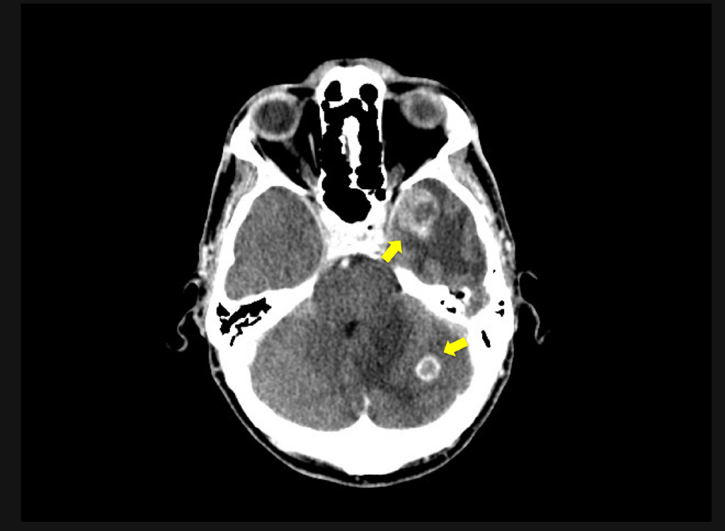 Con el diagnóstico oncológico de adenocarcinoma de pulmón estadio IV con EGFR no mutado y ALK no translocado, el paciente inició tratamiento con quimioterapia y radioterapia holocraneal.