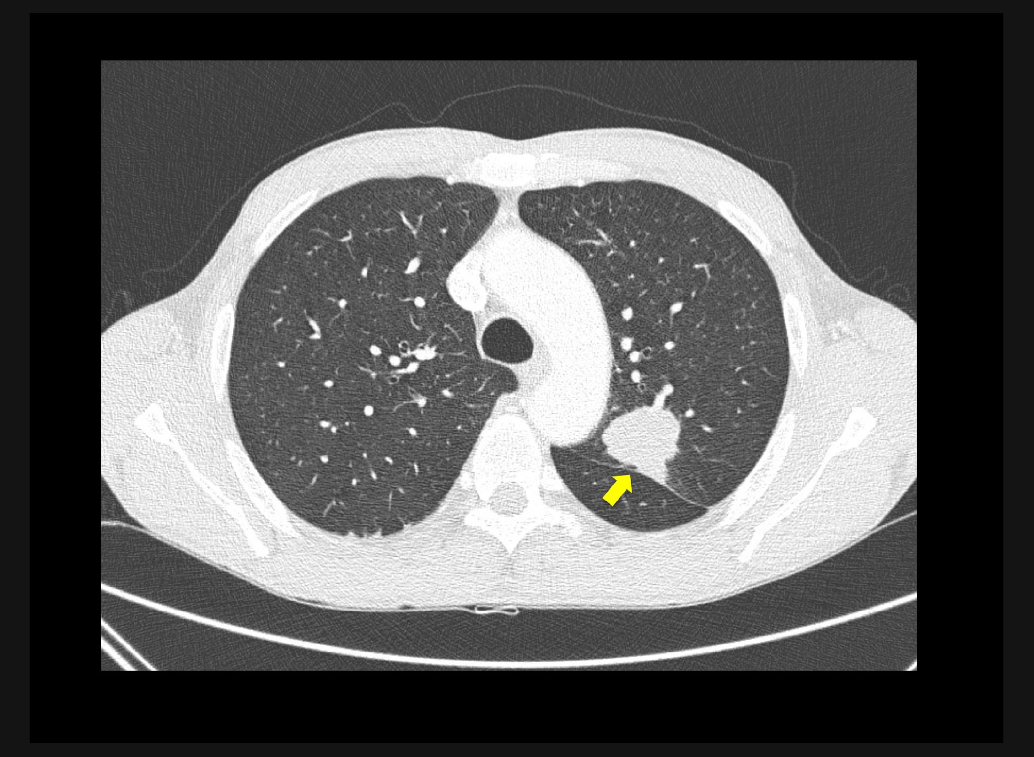 El paciente acudió a urgencias por cefalea hemicraneal persistente que no cedía con analgésicos. A la exploración neurológica se le halló obnubilado sin clara focalidad neurológica por lo que se solicitó un TC craneal que mostró dos imágenes sugestivas de metástasis (Figura 1), con edema perilesional y efecto masa. Se realizó un TC torácico por imagen sugestiva de neoplasia en radiología simple, que mostró una lesión en parénquima pulmonar de 33x26 mm de bordes irregulares y contornos espiculados, situada en el segmento apical posterior del lóbulo superior izquierdo, la cual contacta la cisura. Imagen muy sugestiva de neoplasia primaria de pulmón (Figura 2).