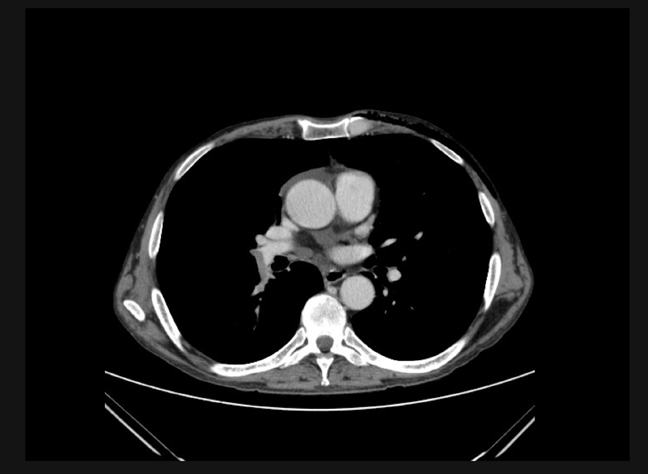 Se realizó una punción biopsia y el paciente fue diagnosticado de adenocarcinoma de pulmón. Como exploraciones adicionales se realizó una broncoscopia para intentar biopsia de posibles adenopatías pero como complicación del procedimiento, se produjo una perforación traqueal, por lo que el paciente fue sometido a una linfadenectomía mediastínica videoasistida. En TC de control posterior se observa la presencia de la perforación de la pared anterior de la tráquea a nivel de la carina con importante neumomediastino y enfisema de partes blandas cervico-torácico (Figura 3). Se aprecian en la TC imágenes de tromboembolismo pulmonar (TEP) bilateral de alta carga trombótica.