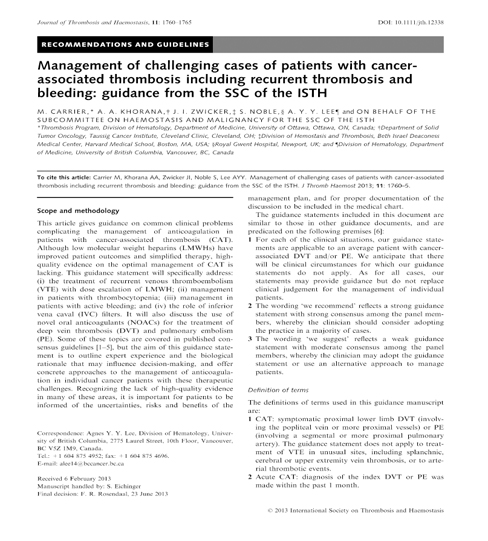 En este artículo se discuten situaciones que ocurren con cierta frecuencia en la práctica clínica en el manejo de las trombosis en los pacientes con cáncer y que son de difícil manejo. La falta de evidencia de calidad sobre la cuestión hace que la establezcan orientaciones basadas en opinión de expertos avaladas por el subcomité de trombosis y cáncer de la Sociedad Internacional de Trombosis y Hemostasia (ISTH).