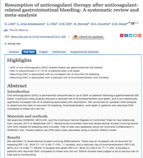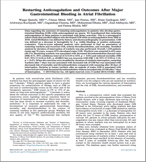 En este trabajo se evalúa en una población amplia de manera retrospectiva las implicaciones pronósticas del reinicio de la anticoagulación. El reinicio de warfarina se relacionó con un menor riesgo de complicaciones tromboembólicas y una menor mortalidad sin un incremento significativo en las recurrencias. Evalúan también las implicaciones en la demora del reinicio de anticoagulación y el reinicio a los 7 días no incrementa el riesgo de resangrado con menor mortalidad y tromboembolismo que si el reinicio se produce al mes.