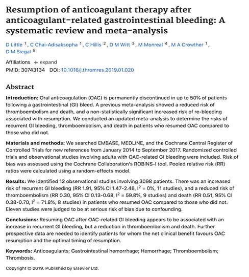 En este metaanálisis se abordan las consecuencias del reinicio de la anticoagulación tras una hemorragia digestiva grave. En general, hasta el 50% de los pacientes anticoagulados que presentan un sangrado digestivo, no reinician la anticoagulación. En un grupo de más de 3000 pacientes en 12 estudios observacionales se ha relacionado el mantenimiento de la anticoagulación con un incremento de hemorragia digestiva recurrente (91%), pero con una reducción del 70% del tromboembolismo recurrente y del 49% de mortalidad, aunque están analizados pacientes con diversas indicaciones de anticoagulación. Es una situación con escasa evidencia de calidad y se necesitan estudios prospectivos dirigidos a evaluar esta situación, especialmente en pacientes con tromboembolismo venoso.