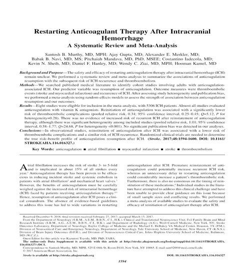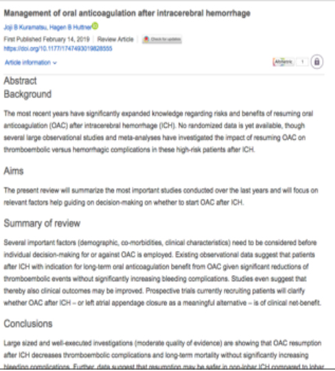 En este metaanálisis se recogen estudios observacionales de hemorragias intracraneales en 5306 pacientes, en general anticoagulados con antagonistas de la vitamina K. Los hallazgos mas relevantes muestran que el reinicio de la anticoaguación se asoció a un menor riesgo de tromboembolismo sin un incremento significativo del riesgo de hemorragia intracraneal recurrente.