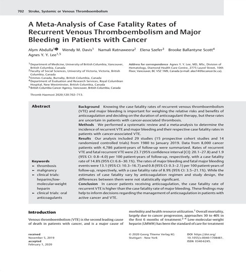 A la hora de sopesar los riesgos y beneficios de la anticoagulación, una de las herramientas de más ayuda es la evaluación de las tasas de mortalidad de los episodios de tromboembolismo venoso recurrente y la mortalidad de las complicaciones hemorrágicas (case fatality rate o CFR). No se conocen esas tasas en pacientes anticoagulados por trombosis asociada a cáncer. En este estudio se realiza un metaanálisis que incluye 8.000 pacientes con un seguimiento equivalente a 4.786 pacientes-años. La tasa de tromboembolismo venoso (TEV) recurrente fue de 23,7 (IC 95%: 20,1-27,8) y la de TEV fatal de 1,9 (IC 95%: 0,8-4,0) por 100 pacientes-años de seguimiento. La CFR fue del 14,8% (IC 95%: 6,6-30,1%). En cuanto al sangrado, la tasa de hemorragia mayor fue de 13,1 (IC 95%: 10,3-16,7) y 0,8 (IC 95%: 0,3-2,1) por 100 pacientes-año, respectivamente, y la CRF del 8,9% (IC 95%: 3,5-21,1%). En resumen, en este metaanálisis se muestra que, en los pacientes con cáncer anticoagulados, la CFR por TEV recurrente es superior a la CFR del sangrado mayor. Esto debe tenerse en cuenta a la hora de valorar las decisiones sobre la anticoagulación, especialmente sobre la duración del tratamiento anticoagulante en pacientes con cáncer activo y TEV.
