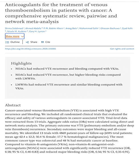 De los resultados de este metaanálisis se puede concluir que los ACOD son una opción efectiva en los pacientes con cáncer que sufren un TEV agudo, pero en los pacientes con alto riesgo de sangrado deben utilizarse con precaución.
