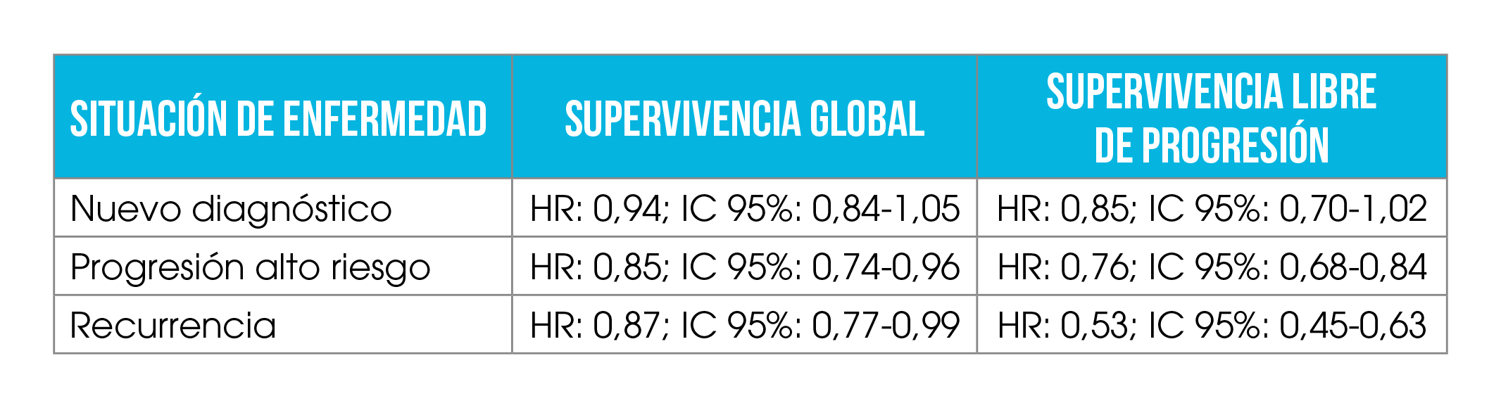 Diferentes metaanálisis [8] han demostrado que el tratamiento combinado de quimioterapia y bevacizumab tiene impacto en la supervivencia tanto libre de progresión como global, en estadios avanzados, en comparación con el mismo tratamiento sin antiangiogénico (Tabla 1).