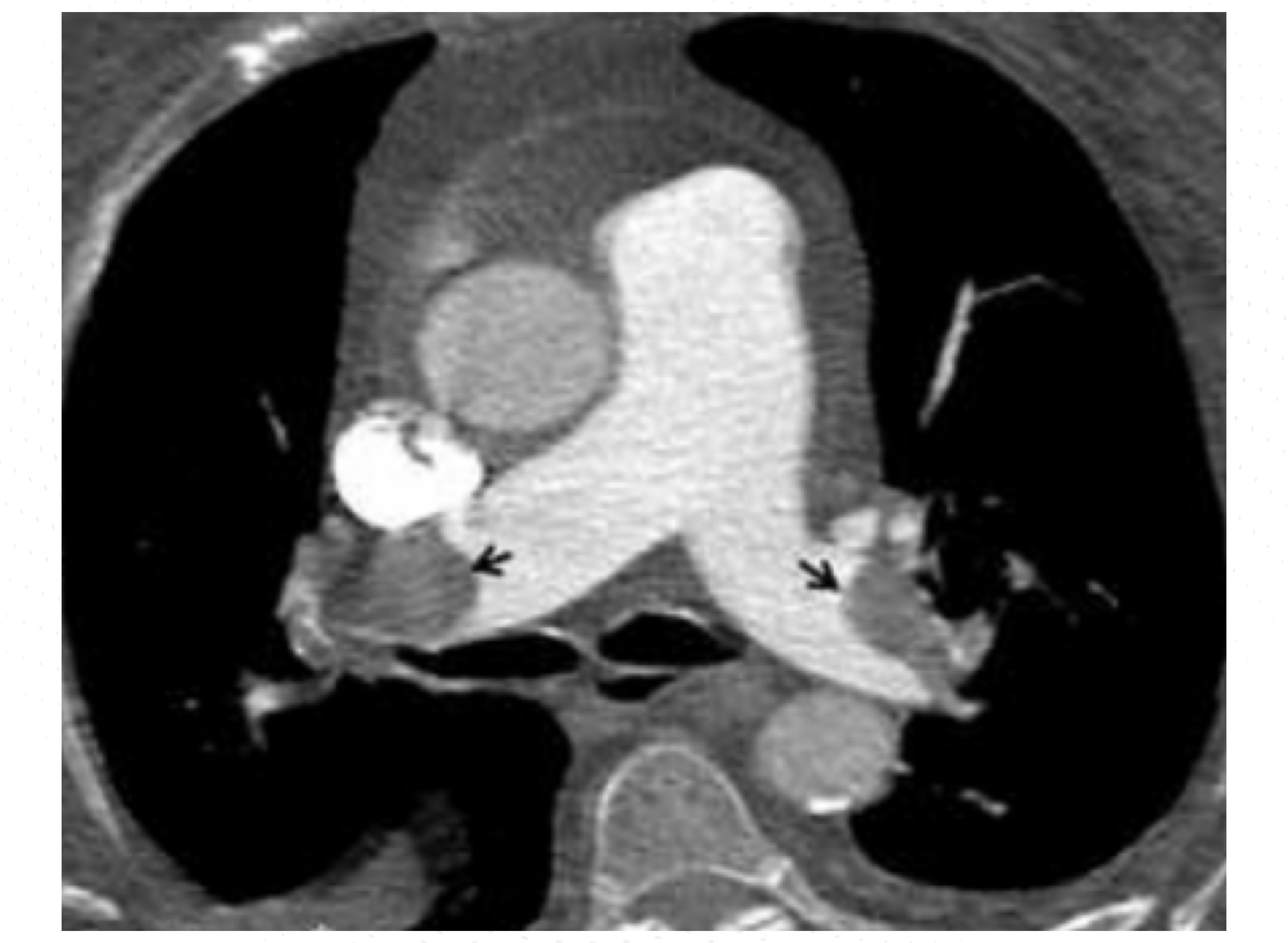 Inició tratamiento con radioterapia y temozolomida concurrente. Durante el transcurso de esta terapia, acudió al Servicio de Urgencias por disnea de instauración súbita, sin alteración hemodinámica ni insuficiencia respiratoria. A la exploración no se apreciaron signos de trombosis venosa profunda en las extremidades. La angiotomografía axial computarizada (angio-TAC) pulmonar confirmó el diagnóstico de un tromboembolismo en la arteria pulmonar principal y bilateral (Figura 1).