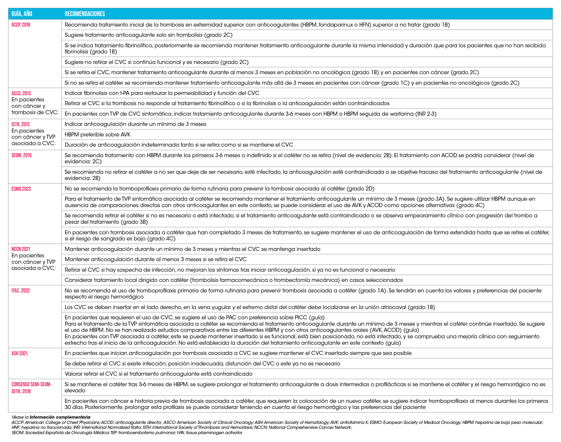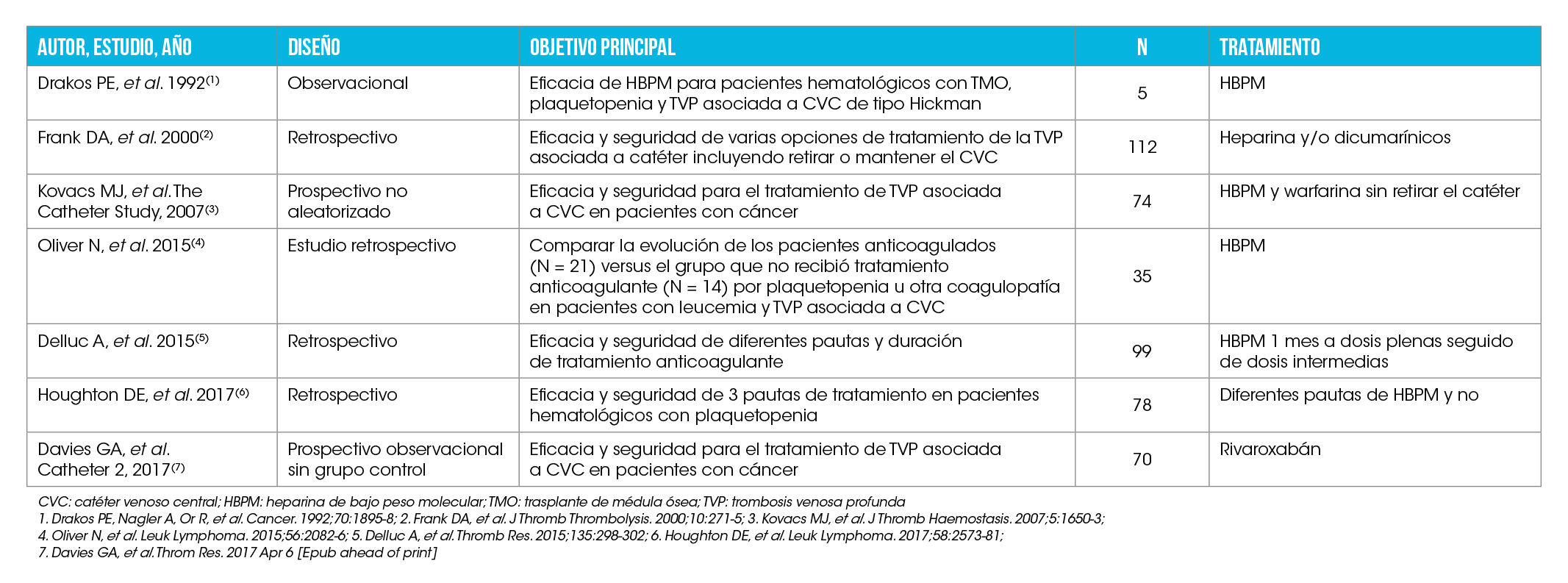 El manejo óptimo de la TVP oclusiva con reducción del diámetro vascular, asociada o no a síntomas, no está bien establecido ya que no disponemos de ensayos clínicos aleatorizados comparando diferentes opciones de tratamiento para esta entidad. Las recomendaciones por parte de las principales sociedades científicas (Tabla 7) se basan en extrapolar la evidencia disponible para el tratamiento de la TVP de extremidad inferior, en los datos de cohortes retrospectivas y observacionales (Tabla 8) y en consideraciones específicas para los pacientes oncohematológicos.