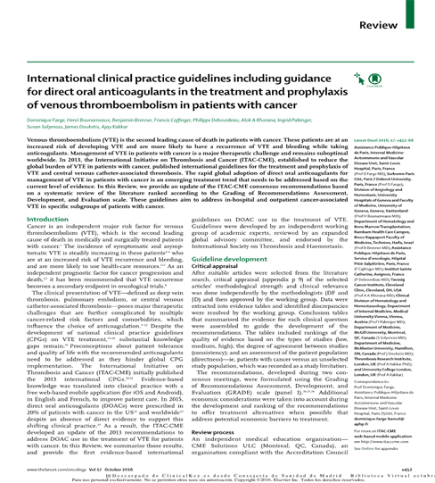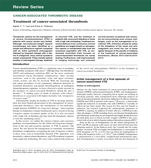 Los artículos de Agnes Lee et al. (Blood, 2013) y de Dominique Farge et al. (Lancet Oncol, 2016) abordan el manejo global de la enfermedad tromboembólica venosa en los pacientes y en ambos se dedica un pequeño apartado con la información concisa y esencial relacionada con la prevención y el tratamiento de la trombosis asociada al catéter. Teniendo en cuenta que las recomendaciones para el tratamiento de esta entidad se basan en gran parte en extrapolar a partir de la evidencia disponible para el manejo global de la trombosis venosa profunda (TVP) de extremidades inferiores y del tromboembolismo pulmonar (TEP) en los pacientes con cáncer, en mi opinión ambos artículos serían de lectura obligatoria para todos los clínicos que tratamos este tipo de pacientes por 3 motivos: 1) en ellos se revisa con precisión y rigor científico la literatura médica disponible y los límites actuales de la evidencia; 2) ofrecen opciones de manejo clínico razonables y con sentido práctico para los médicos asistenciales que se enfrentan a la atención de pacientes cada día más complejos; y 3) son de lectura fácil y amena.