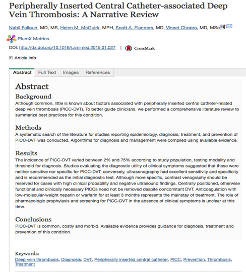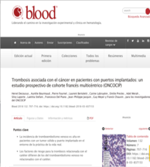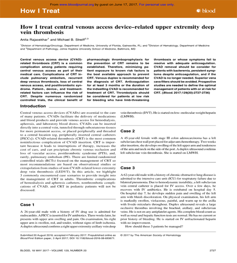 El artículo firmado por Rajasekhar A y Streiff M (Blood, 2017) es otro excelente y ameno artículo de revisión, este sí, centrado en las complicaciones trombóticas de los pacientes portadores de catéter venoso central (CVC), aunque no específicamente de población oncológica. El artículo está liderado por el Dr. Michael Streiff de la Universidad Johns Hopkins de Baltimore (EUA), centro pionero en programas de prevención y tratamiento de la enfermedad tromboembólica venosa. El mismo autor lidera las guías clínicas de trombosis de la National Comprehensive Cancer Network (NCCN). El artículo también combina el rigor científico con sugerencias y planteamientos con sentido común práctico que resultan de gran interés para los clínicos.