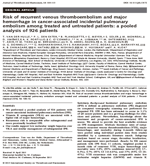 Se trata de un estudio muy referenciado en el escenario de la enfermedad tromboembólica venosa (ETV) incidental en el paciente oncológico, que realizó un metaanálisis con datos individuales de 11 cohortes con 926 pacientes en total. Pacientes con cáncer y embolia pulmonar (EP) incidental. El estudio evidenció la elevada tasa de recurrencias de los pacientes oncológicos con EP incidental, especialmente si no eran tratados con tratamiento anticoagulante (12% de recurrencias en un periodo de 6 meses de seguimiento).