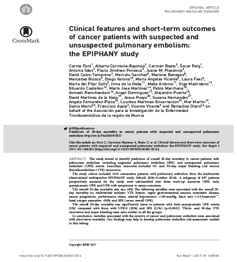 Se trata de un interesante estudio de un registro ambispectivo con más de 1.000 pacientes pero que incluyó 497 pacientes seguidos de forma prospectiva y que fueron subclasificados en tres grupos: EP sospechada sintomática, EP no sospechada sintomática y EP no sospechada verdaderamente asintomática. En primer lugar, se observó que muchos pacientes con EP incidental (no sospechada) no son verdaderamente asintomáticos. Las recurrencias y hemorragias fueron similares en los 3 grupos, pero se observó una mortalidad a 90 días muy inferior en los pacientes con EP no sospechada verdaderamente asintomáticos frente a los otros 2 grupos de EP sintomática.
