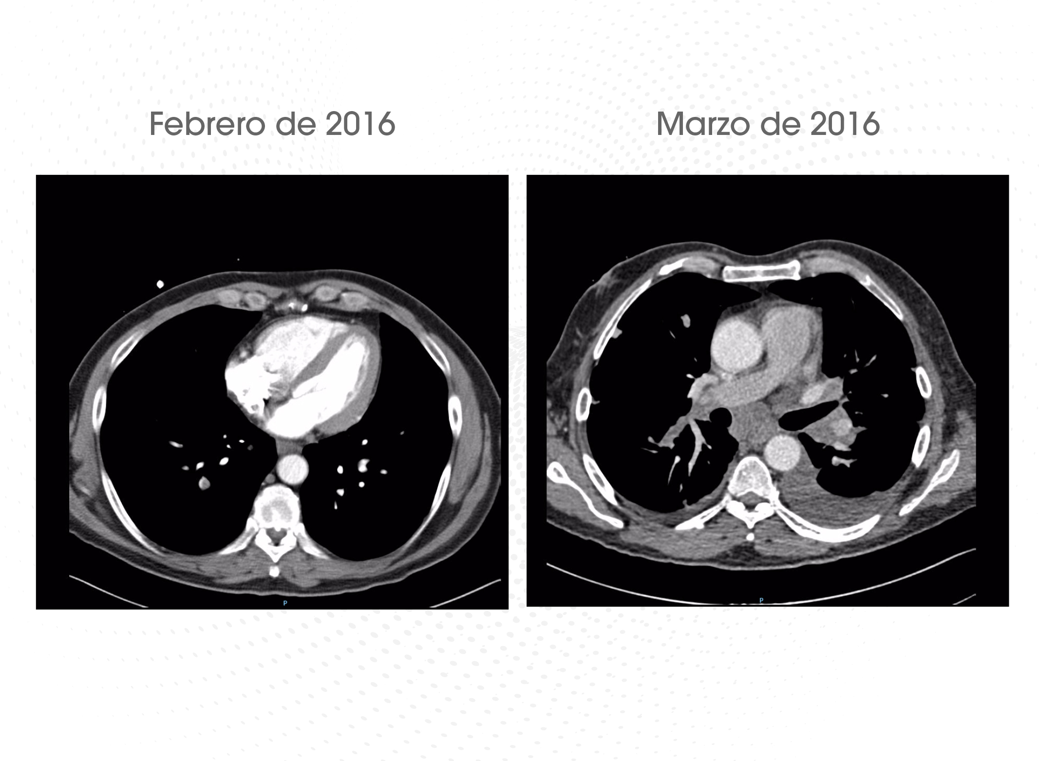 El paciente fue incluido en un ensayo clínico con inmunoterapia con un anticuerpo monoclonal biespecífico. A las 3 semanas (marzo de 2016) en la TAC de control informan de un aumento de tamaño de la imagen de TEP en el lado derecho (Figura 1). Clínicamente, el paciente se encontraba estable. Se decide aumentar un 25% la dosis de HBPM: 12.500 UI/día.