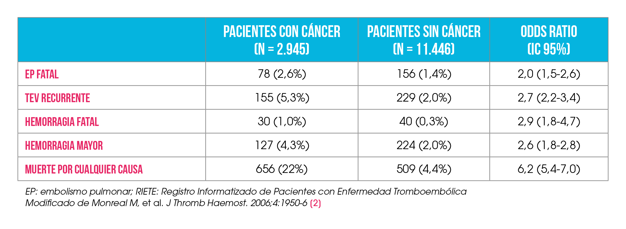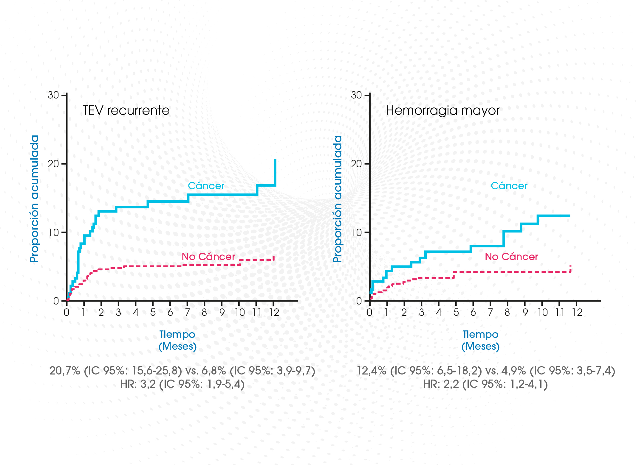 Los pacientes con cáncer que sufren un episodio de tromboembolismo venoso (TEV) tienen una incidencia muy superior (alrededor de 3 veces más) de recurrencias (y también de hemorragias) que los pacientes sin cáncer (Figura 1 y Tabla 1) [1,2]. El manejo de una retrombosis acontecida a pesar del tratamiento anticoagulante constituye todo un reto para el clínico. Además de un análisis meticuloso de las circunstancias que rodean la recurrencia [info], es imprescindible una valoración del riesgo hemorrágico individual, así como del estado del proceso oncológico de base.Por otra parte, los pacientes con TEV asociado a cáncer tienen también un mayor riesgo de recurrencia al suspender el tratamiento una vez completados 3-6 meses de anticoagulación, particularmente en caso de persistencia de neoplasia activa [info], lo que influye en la toma de decisiones acerca de la duración óptima del tratamiento anticoagulante en esta población [3]. Aunque se trata de un tema de gran interés, en este módulo nos vamos a enfocar únicamente en las recurrencias durante el tratamiento anticoagulante.