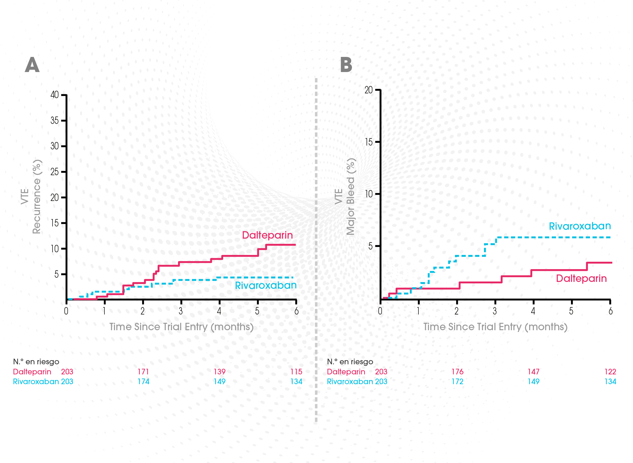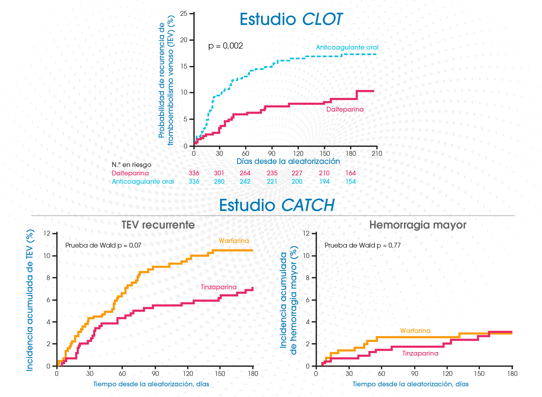 A pesar de que la población que participa en ensayos clínicos puede que no sea totalmente representativa de la población del “mundo real” (los criterios de inclusión de los ensayos tienden a excluir aquellos pacientes con peor condición clínica), la tasa de TEV recurrente en el brazo tratado con dalteparina o tinzaparina osciló entre el 7 y el 9%. Por otra parte, en un estudio prospectivo en pacientes con TEV asociado a cáncer tratados con bemiparina publicado en 2020, la incidencia acumulada de recurrencia tromboembólica a los 6 meses fue solo del 2,4% [7].