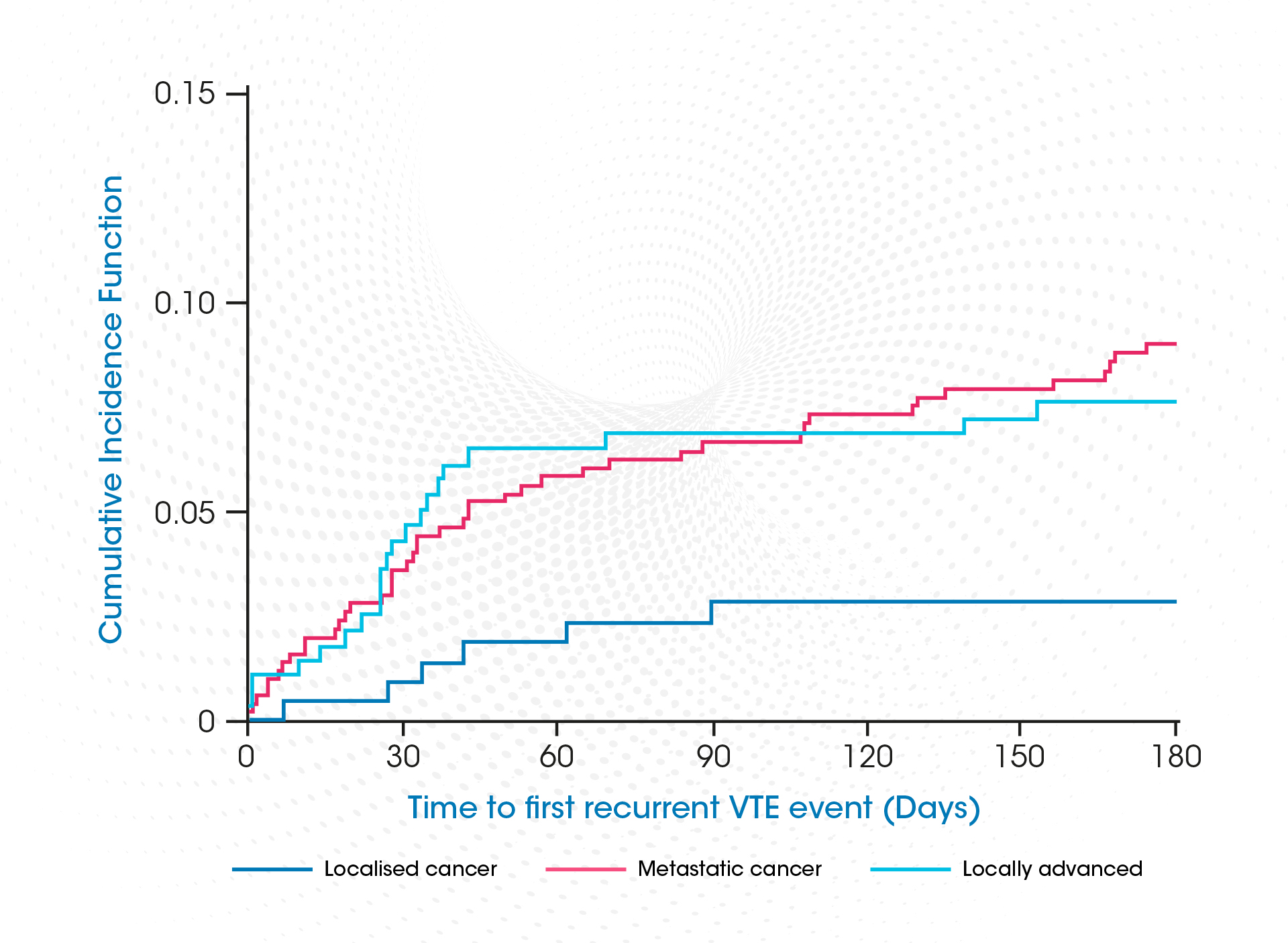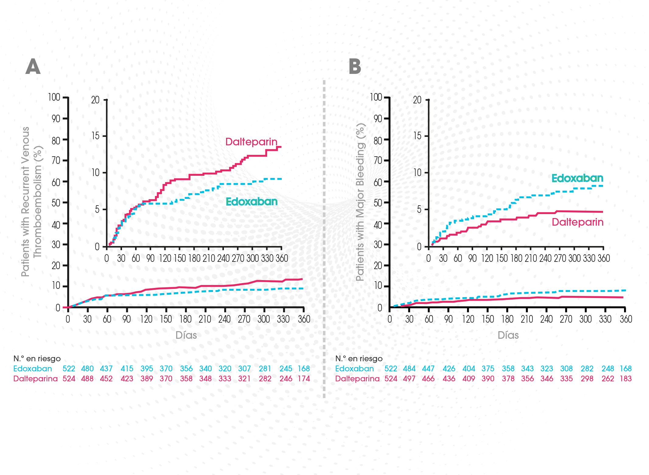 En el estudio Hokusai-VTE cancer, la incidencia acumulada de retrombosis durante los primeros 6 meses tras un episodio de TEV fue superior (hasta el doble), en ambos brazos del estudio, en pacientes con cáncer gastrointestinal, pulmonar o genitourinario en comparación con pacientes con neoplasia de mama o tumores hematológicos [15].