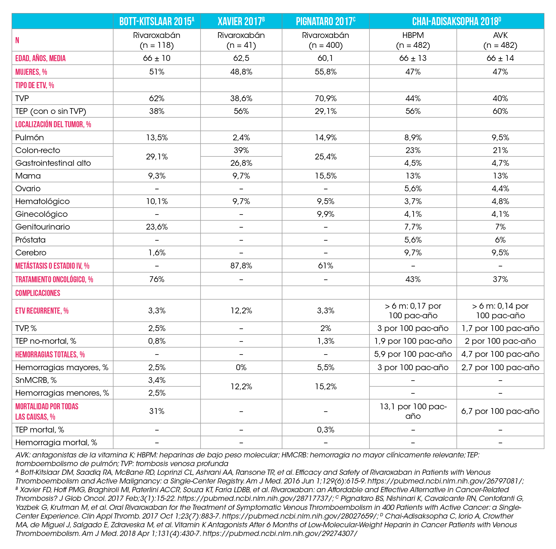 Bott-Kitslaar et al. [11] analizaron retrospectivamente un registro de pacientes (con o sin cáncer) tratados con ACOD. El objetivo primario de eficacia fue el tromboembolismo venoso o arterial sintomático, mientras que el objetivo primario de seguridad fue la hemorragia mayor. De los 404 pacientes del estudio, 296 fueron tratados con rivaroxabán y solo 118 tenían cáncer. Después de un seguimiento medio de 1,36 ± 0,5 años, las tasas de recurrencia de ETV y hemorragia mayor fueron de 3,3 y 2,5%, respectivamente. En 2017, se realizó otro estudio retrospectivo de pacientes con cáncer y ETV que fueron tratados con rivaroxabán (n = 41) [12]. El objetivo del estudio fue comparar la eficacia, la seguridad y el coste de rivaroxabán. Durante una mediana de seguimiento de 5,5 meses, hubo un 12,2 y un 12,2% de hemorragias no mayores y de ETV recurrente, respectivamente. En 2017, Pignataro et al. [13] analizaron la experiencia de un solo centro con rivaroxabán en 400 pacientes con cáncer y ETV. La mediana de tratamiento anticoagulante fue de 118 días y durante el seguimiento (hasta 12 meses) hubo un 3,25% de ETV recurrente y un 5,5% de hemorragias graves.