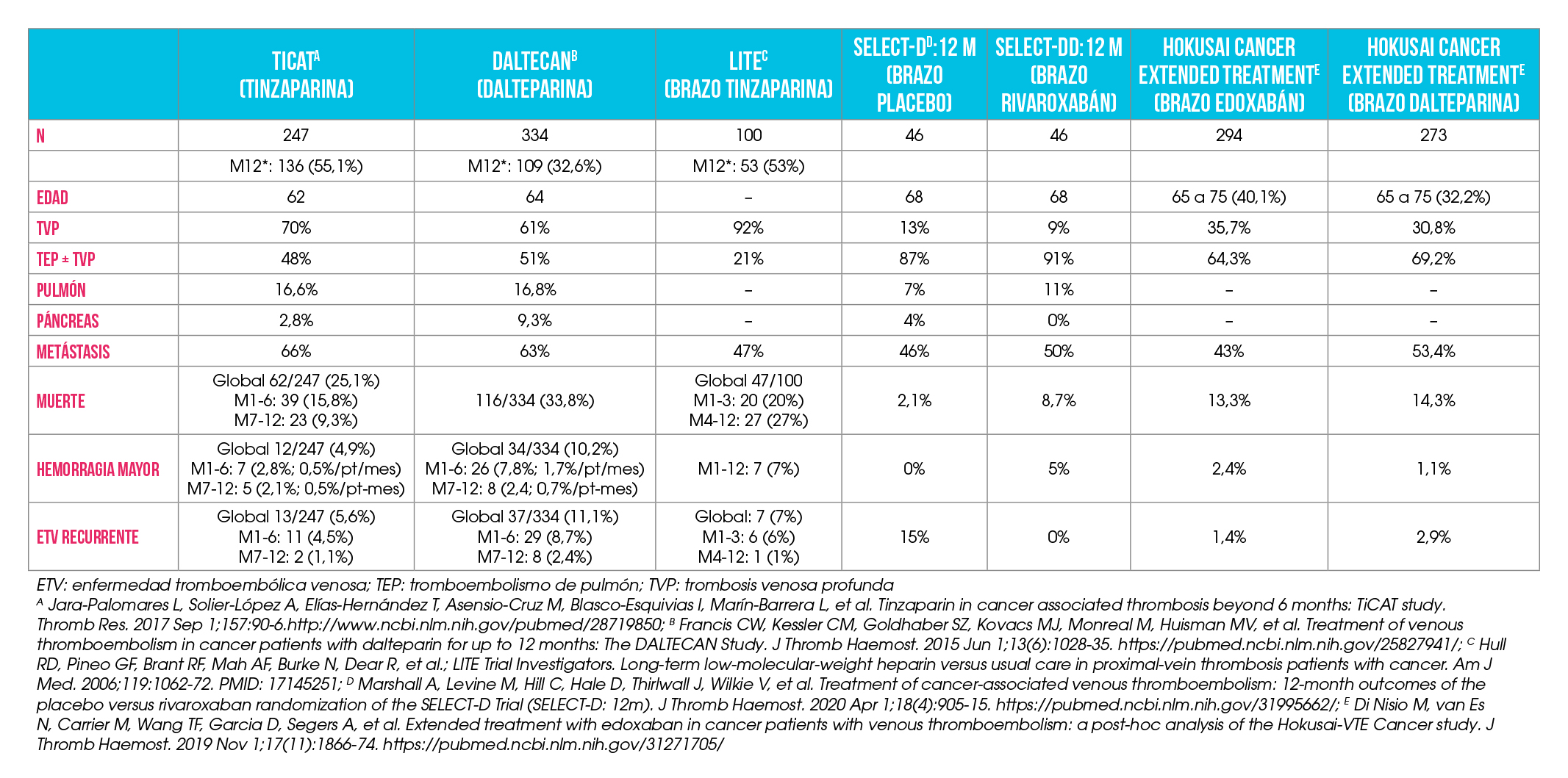 El tratamiento extendido de dalteparina más allá de los 6 meses de la ETV se investigó en un estudio prospectivo, internacional, multicéntrico, abierto, de un solo brazo (estudio DALTECAN) [19]. La tasa de ETV recurrente a los 7-12 meses fue del 4,1%, observando, en términos relativos, una reducción de más del 50% con respecto a la observada durante los primeros 6 meses (8,7%). Del mismo modo, las hemorragias mayores fueron menos frecuentes más allá de los 6 meses de tratamiento. Tomados en conjunto, estos datos proporcionan evidencia prospectiva sobre la eficacia y la seguridad del tratamiento prolongado (es decir, más 6 meses) con dalteparina. En 2017, Jara-Palomares et al. [20] publicaron el estudio TiCAT: un estudio prospectivo, multicéntrico, abierto, de brazo único con tinzaparina en pacientes con cáncer y ETV. El objetivo principal fue evaluar la seguridad más allá de los 6 meses (utilizando como objetivo las hemorragias graves, las hemorragias clínicamente relevantes y las hemorragias no mayores clínicamente relevantes). Al comparar los meses 1-6 frente a los meses 7-12, los autores encontraron una disminución de las tasas crudas, aunque no se observaron diferencias estadísticamente significativas en términos de sangrados clínicamente relevantes (5,4 versus 3,7%, respectivamente). Del mismo modo, hubo una hemorragias, aunque sin ser significativa, de menor tasa de ETV recurrente durante los meses 7-12 (1,1%; IC 95% = 0,1-3,9%), en comparación con los meses 1-6 (4,5%; IC 95% = 2,2-7,8%; p = 0,08). Los estudios DALTECAN y TiCAT proporcionaron información clínicamente relevante sobre la seguridad del tratamiento extendido más allá de los 6 meses en pacientes con cáncer y ETV, aunque con la limitación de no ser ensayos clínicos aleatorizados.